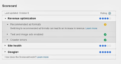 Just as an example, if your "Revenue Optimization" on the Scorecard shows less than 5 blue dots, you can find out why by clicking the little down arrow next to "Revenue Optimization". The sections listed are "Recommended Ad Formats" (are you using all the most recommended ad sizes and formats?); "Text and image ads enabled" (have you enabled all your ads for text and image?); and "Crawler Errors". All of these subsections will have a green checkmark, a yellow exclamation point (recommends changes) or a red exclamation point (needs work). The small arrow next to each section opens up to display their recommendations.