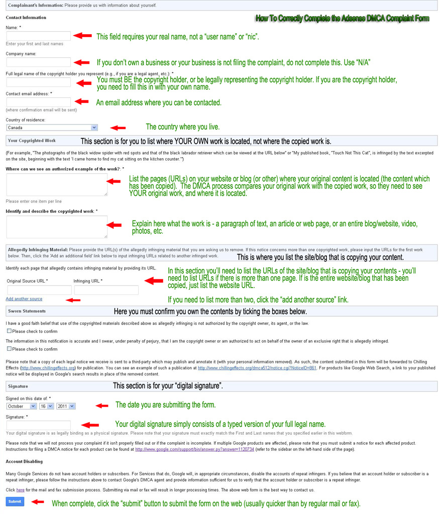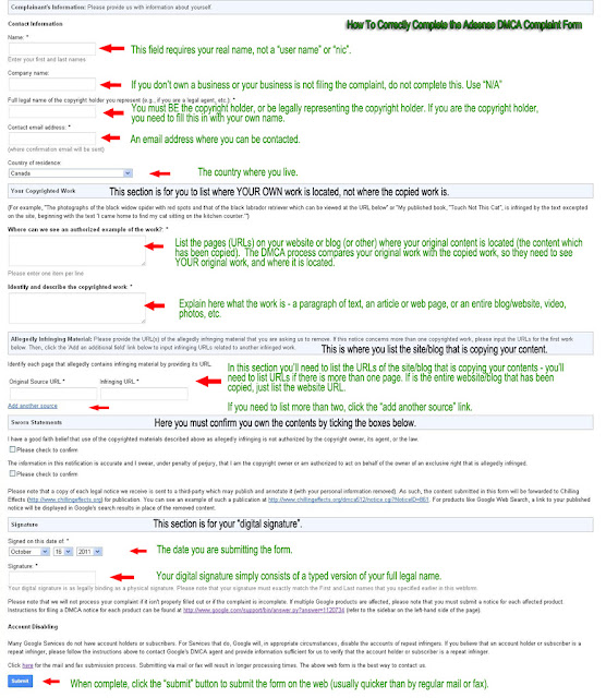 You need to complete the forms fully and correctly, and from some of the DMCA notices I've seen on Chilling Effects...some people don't understand how to fill out the forms. Below are copies of the DMCA notices for Adsense and Blogger, with instructions on how to complete them correctly (click the image to get a larger view).